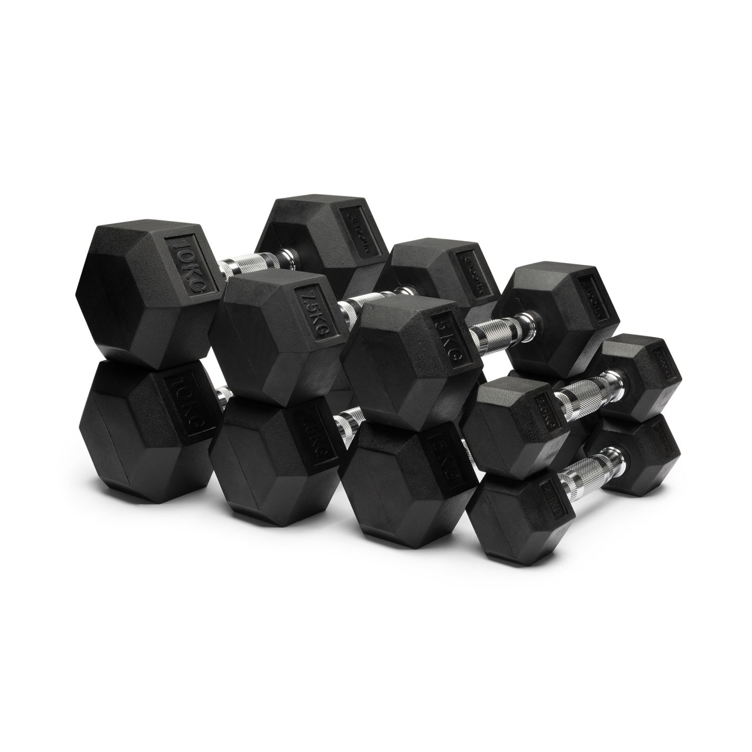 De zeshoekige vorm voorkomt ongewenst wegrollen en maakt ze geschikt voor een breed scala aan oefeningen, zoals renegade rows, push-ups en traditionele krachttraining.