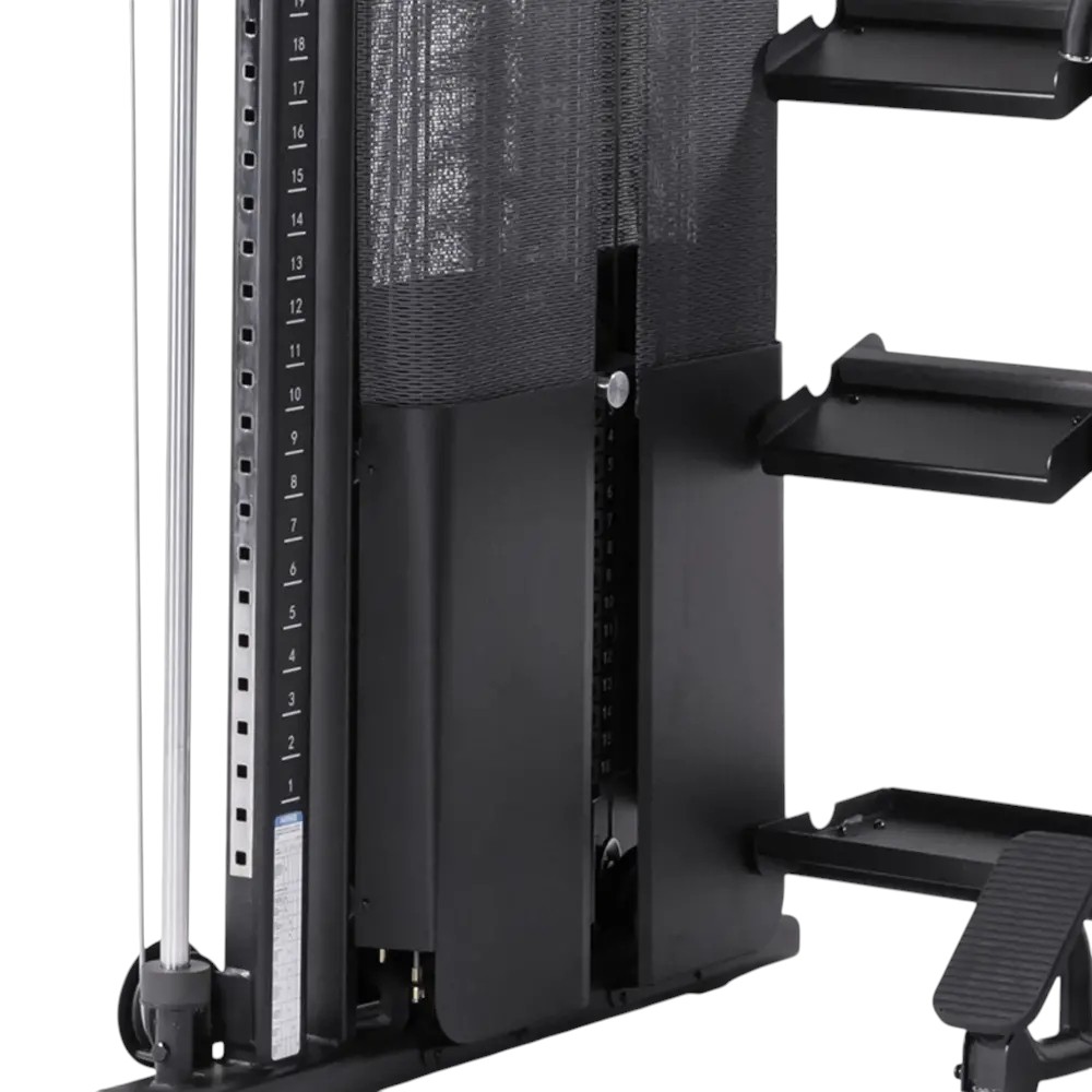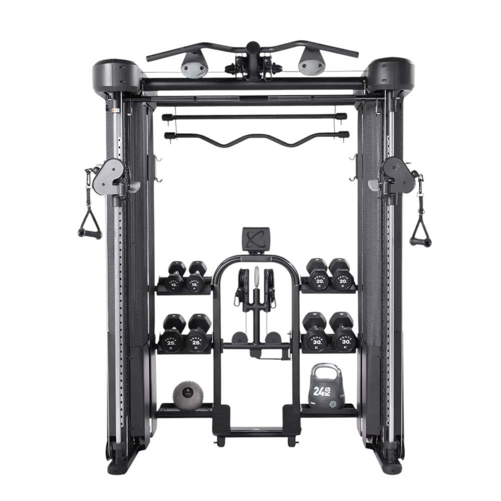 De gepatenteerde Smith-bar is volledig geïntegreerd met de gewichtenstapel en beschikt over een uitgebalanceerd systeem voor moeiteloze overgangen tussen oefeningen. Met twee gewichtstapels van elk 75 kg en een uniek gewichtsvermenigvuldigersysteem, kan de weerstand op de Smith-bar worden verdubbeld tot 160 kg voor intensievere trainingen. De machine beschikt ook over 6 opbergrekken voor dumbbells, kettlebells en meer, allemaal in een compact ontwerp.