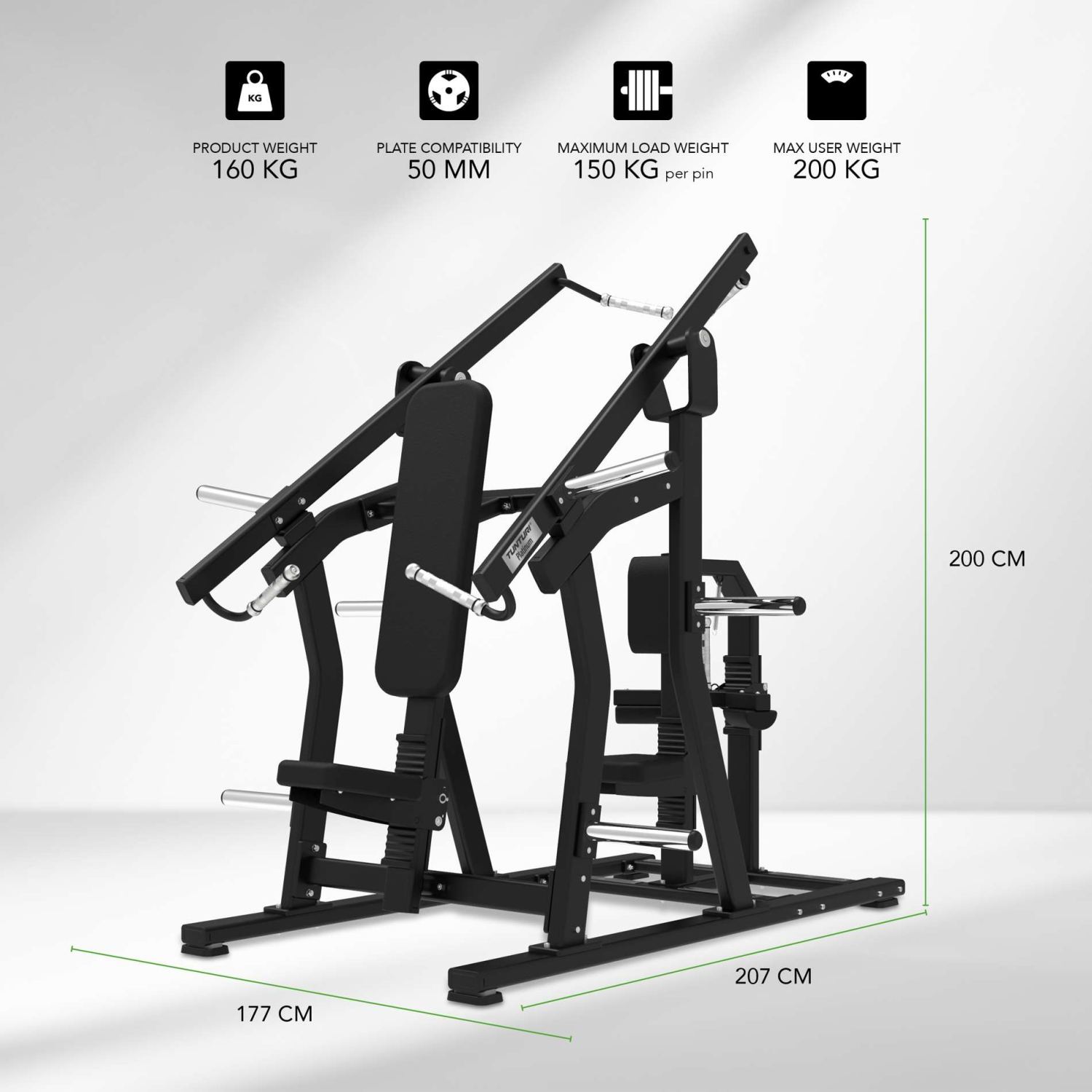 De iso-laterale bewegingsarmen vormen het hart van dit toestel. Door deze onafhankelijke bewegingstraining ontwikkel je beide kanten van het lichaam gelijkmatig en voorkom je spieronevenwichtigheden. De beweging is natuurlijk, vloeiend en volledig gericht op maximale spieractivatie. Dankzij het plate-loaded systeem train je met losse halterschijven, waardoor je de weerstand progressief kunt opbouwen en de krachtontwikkeling realistischer aanvoelt dan bij een traditionele gewichtsstack.