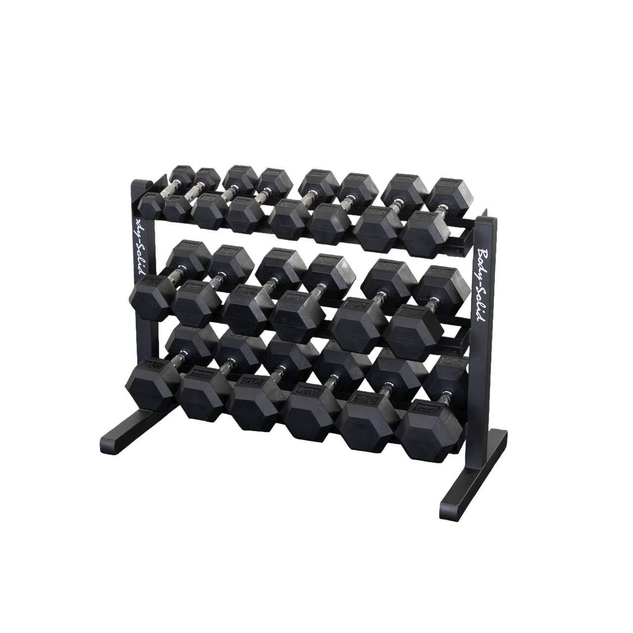 Houd uw trainingsruimte geordend, schoon en vooral veilig met deze Body-Solid 3 laags dumbbell rek.