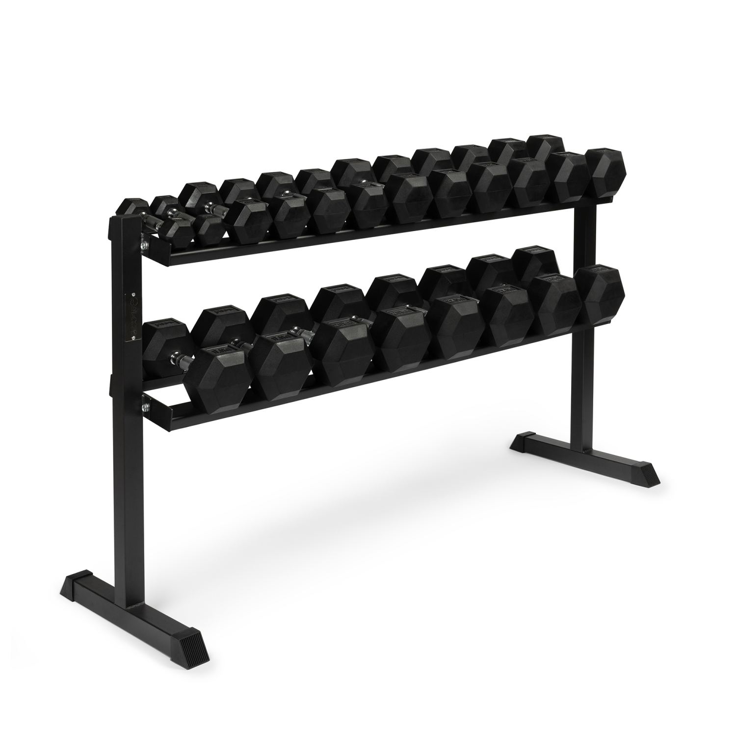 Het NUCCLR dumbbellrack 2 laags combineert functionaliteit en stijl om je fitnessruimte georganiseerd en professioneel te houden.